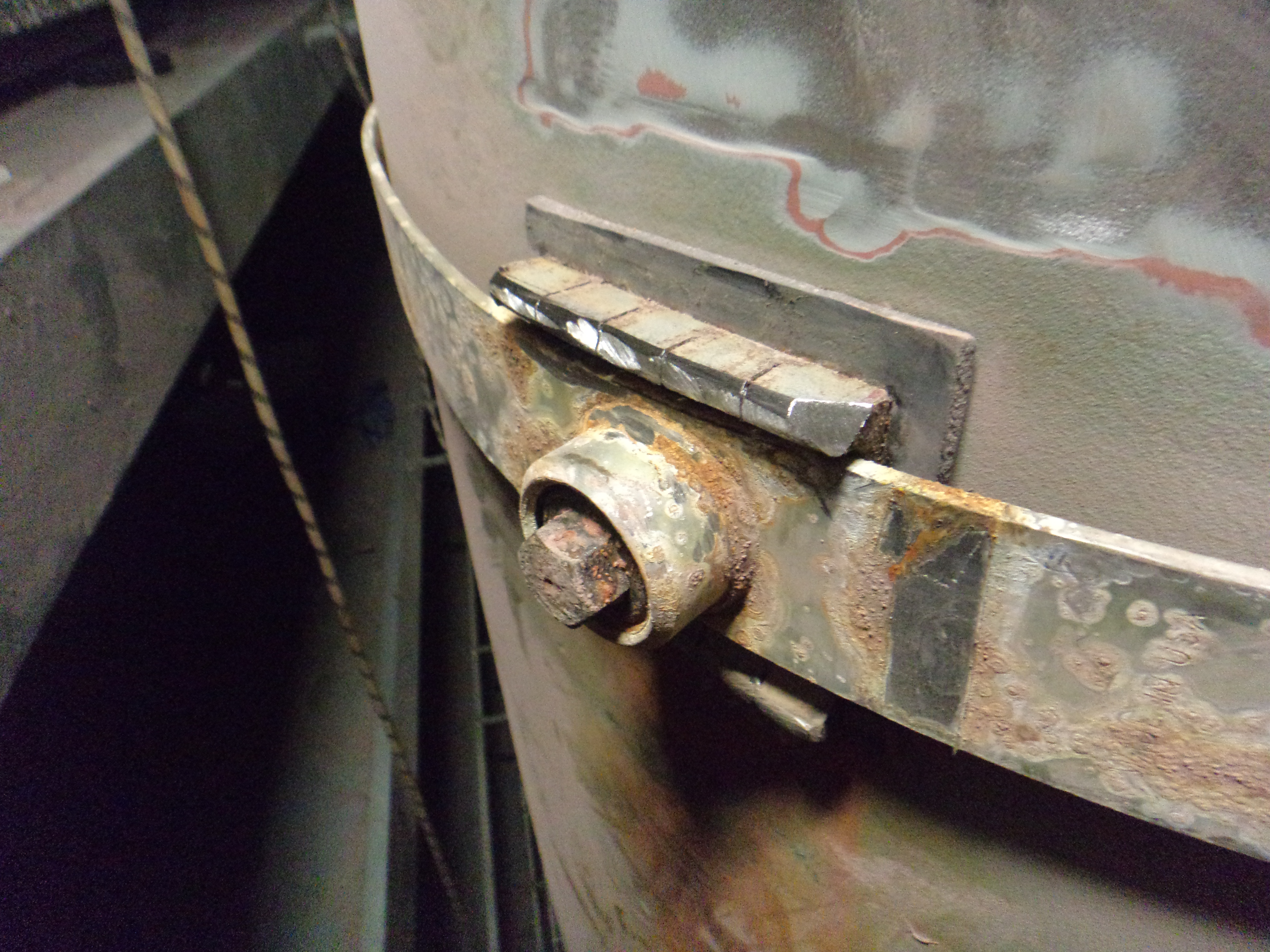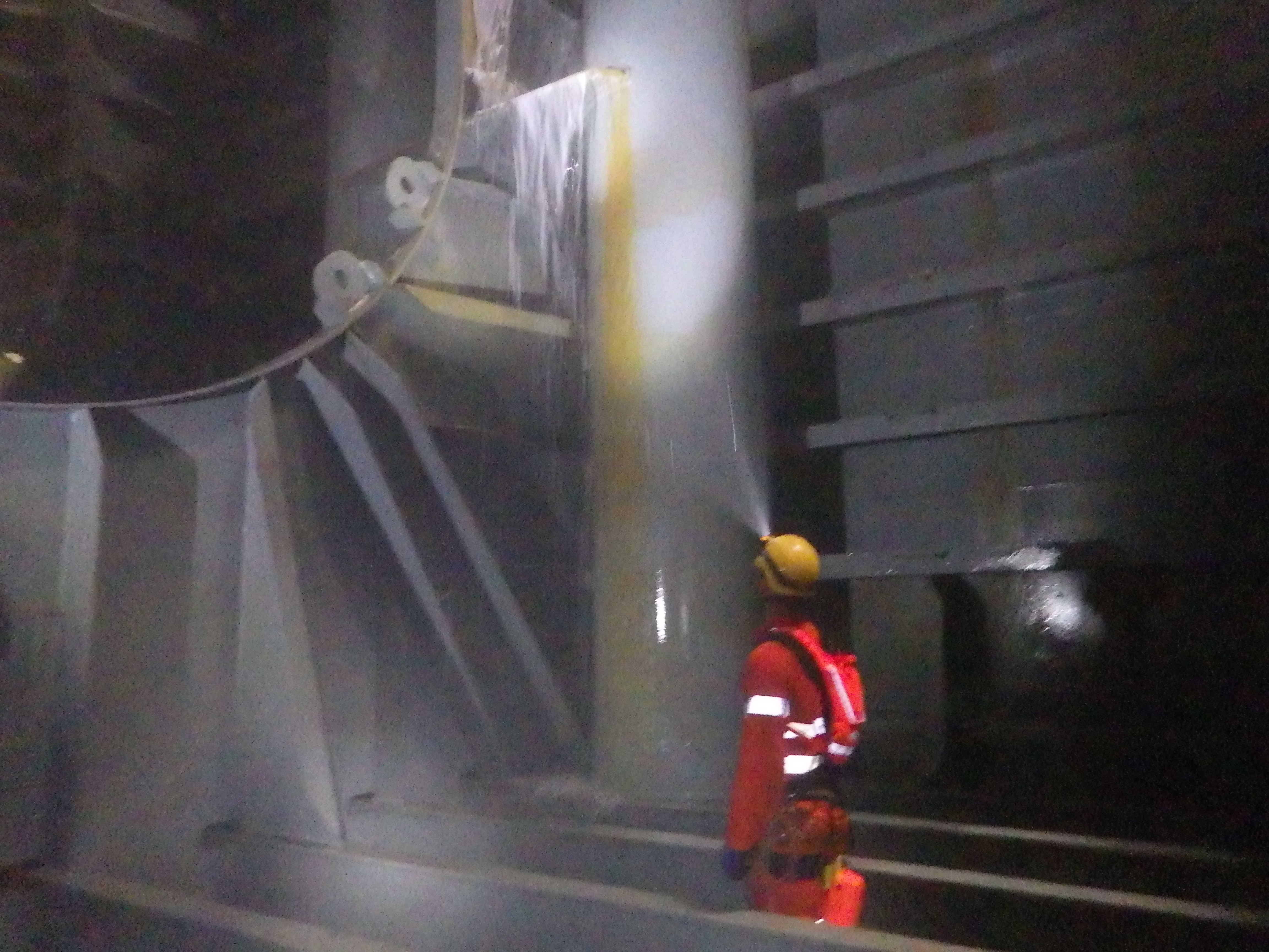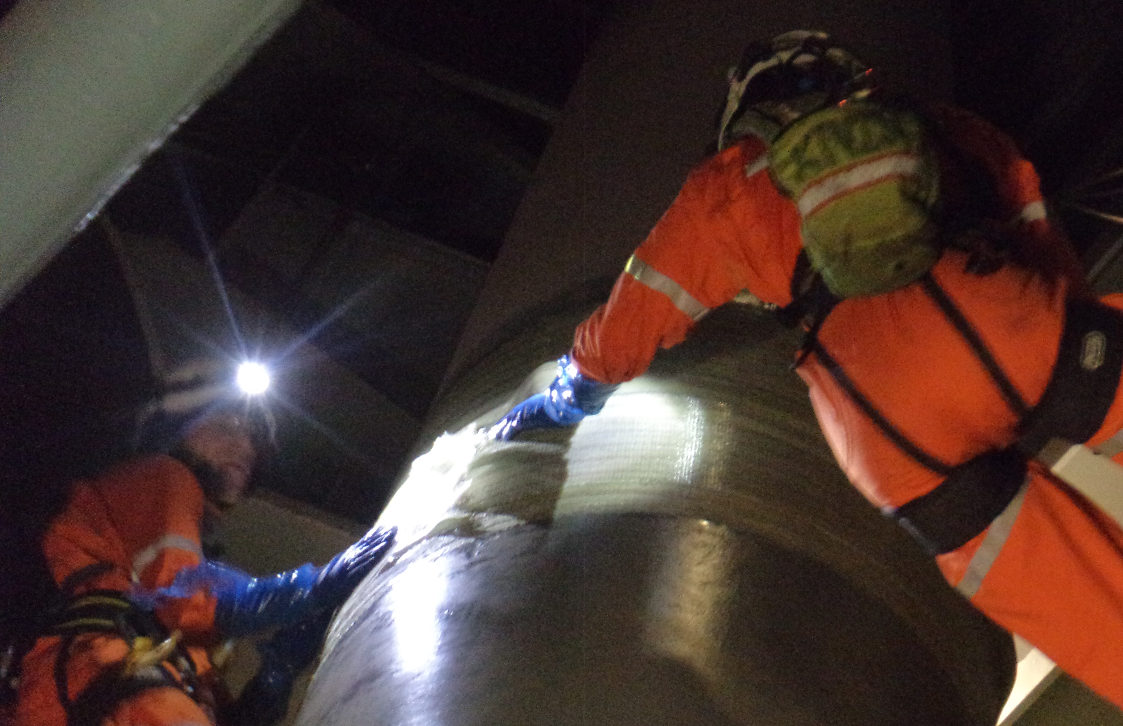 The repair site was 6 meters above base level of the tank, requiring the work to be carried out on ropes.